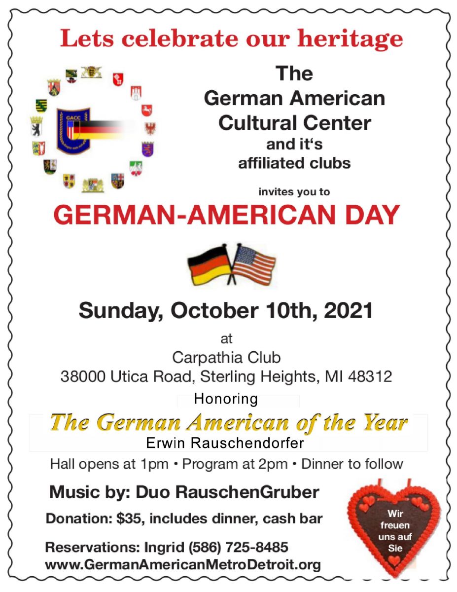 The annual German-American Day celebration is Sunday, October 10. Please join the celebration as we honor Erwin's achievement. Call Rita by September 30 to let her know you'd like a ticket; she will make the final arrangements with the chairwoman so we can all sit together.